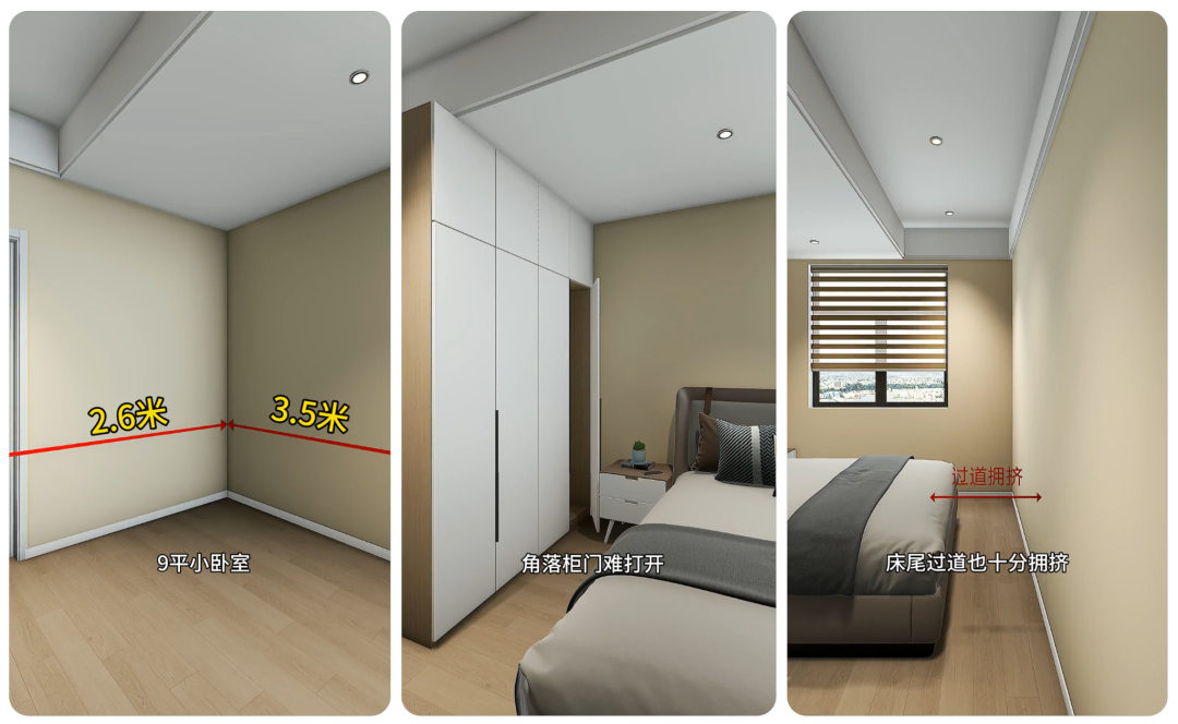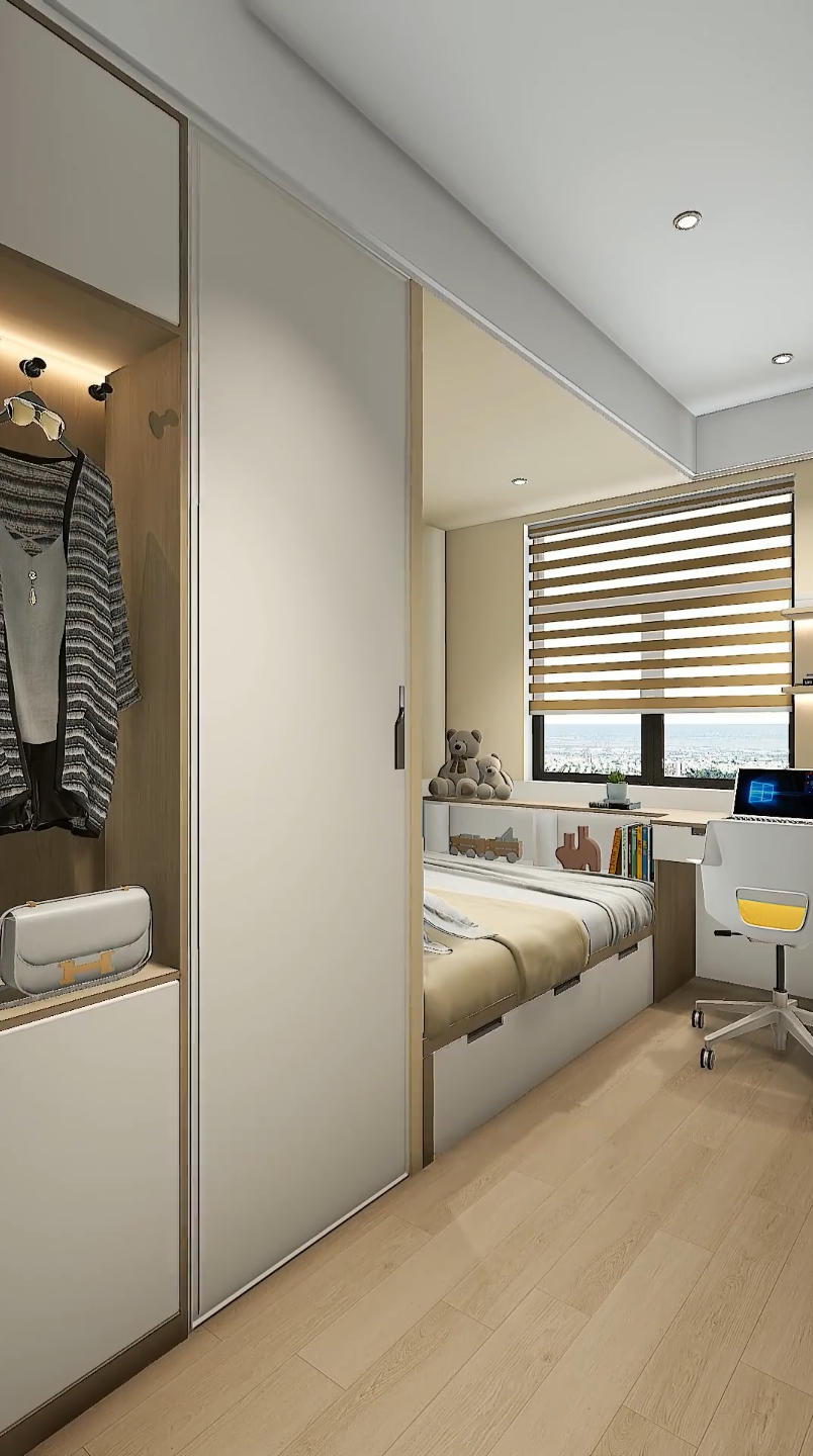 不少人觉得 9 平小卧室只能 “床 + 衣柜” 将就住 —— 床放中间,衣柜贴墙,结果角落柜门打不开,床尾过道挤得转不开身,想放张书桌都没地儿,更别说装衣帽间了。