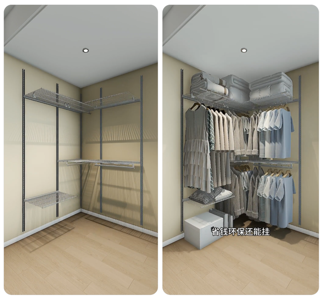 别做笨重的木质衣柜占空间!先在墙面固定几根金属立柱,再装可调节的金属衣架 —— 不用打太多钉子,安装简单还省钱,关键没有甲醛污染,住得放心。