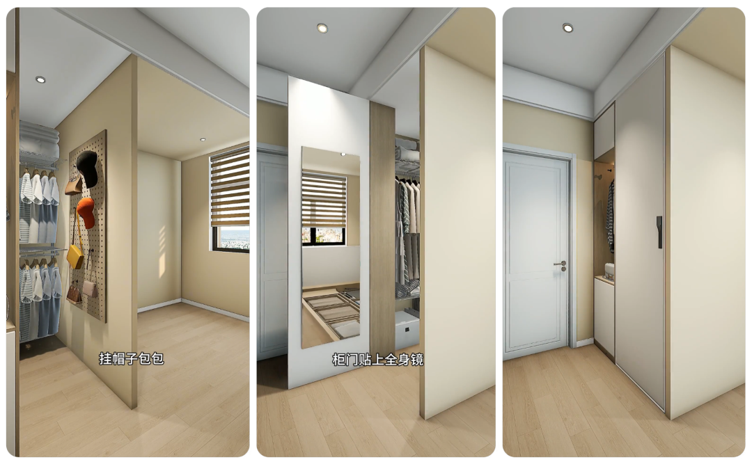 隔断外侧装一扇柜门,柜门内侧贴全身镜,平时关上门就是独立衣帽间,换衣服不怕走光,出门前还能对着镜子整理穿搭,不用再跑到卫生间。
