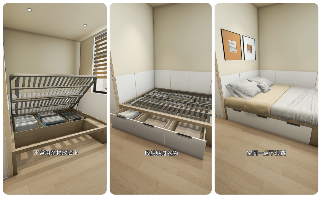 别买传统床占地方!在床边定制地台床(高度 35 公分左右),比成品床省空间,还能坐在床边看书、玩手机。