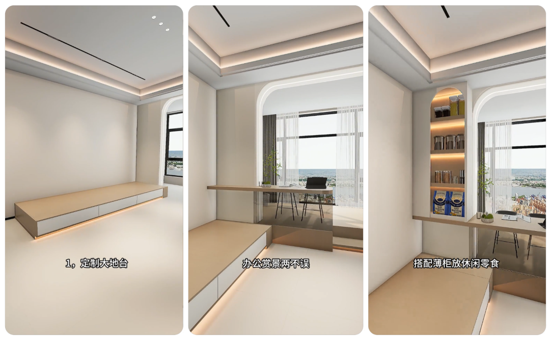 最新做法:定制大地台,直接延伸到阳台,地台高度 30-40cm,平时能坐能躺;顺着垭口再做个窄吧台,台面上放笔记本电脑就能办公,抬头还能看阳台风景,办公赏景两不误。