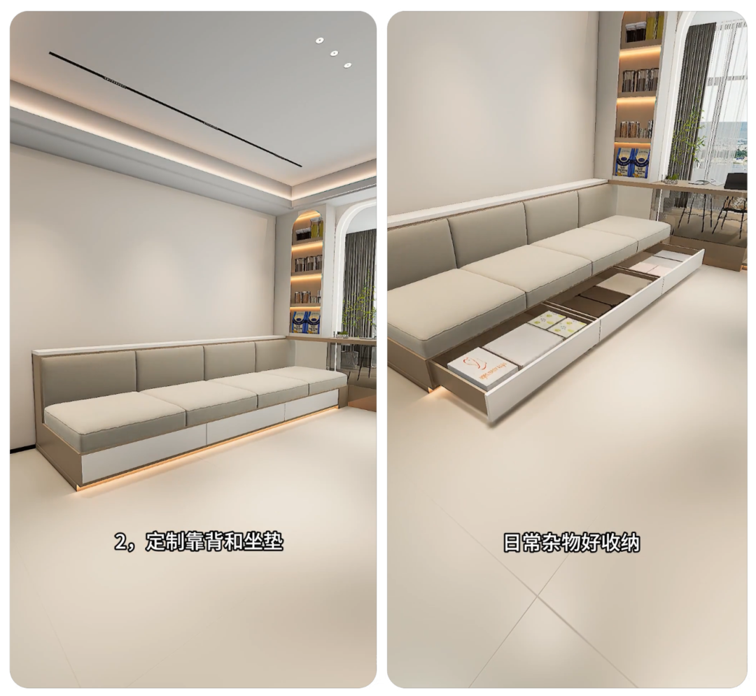 最新做法:根据地台尺寸定制沙发靠背和可拆洗坐垫,坐感和成品沙发一样舒适;关键是沙发下方做整排大抽屉,抽屉深度 40-50cm,日常杂物、孩子玩具、换季抱枕全能塞进去,关上抽屉客厅瞬间整洁,地面无卫生死角。