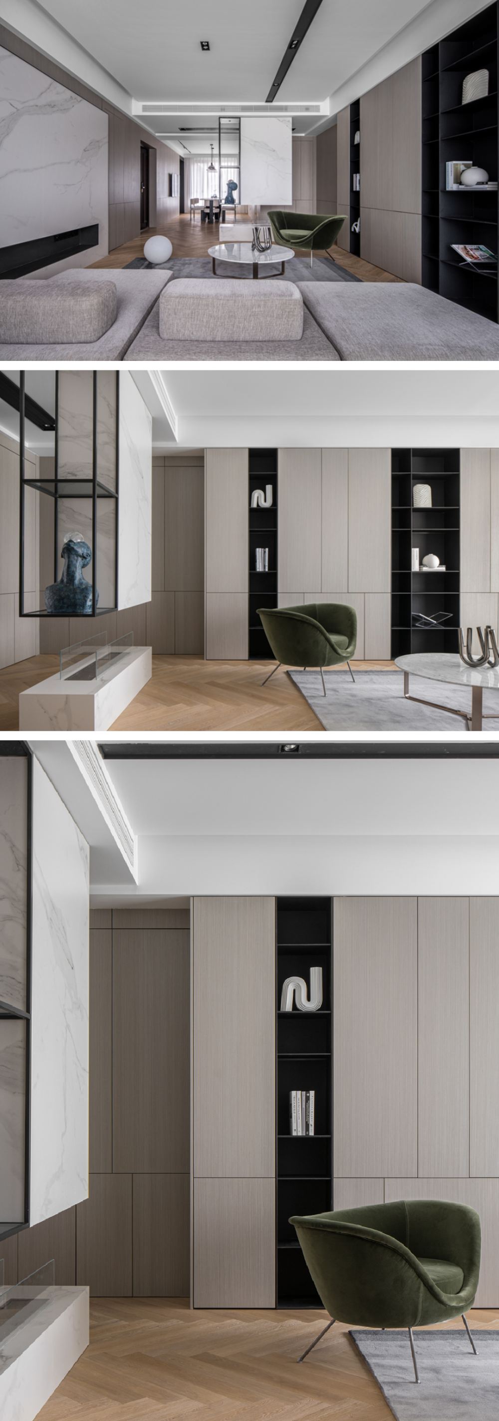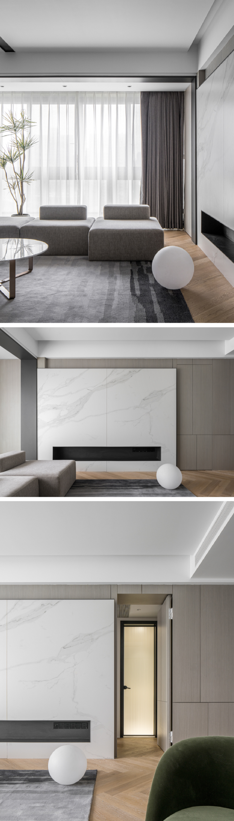 沙发背景墙采用木饰面基底叠加大理石材质,构成温润与冷冽的层次对比。墙面下方嵌入壁炉。其中,次卧门被巧妙隐于木饰面的统一线条之内,实现视觉高度整合,呈现简约大气的高级质感