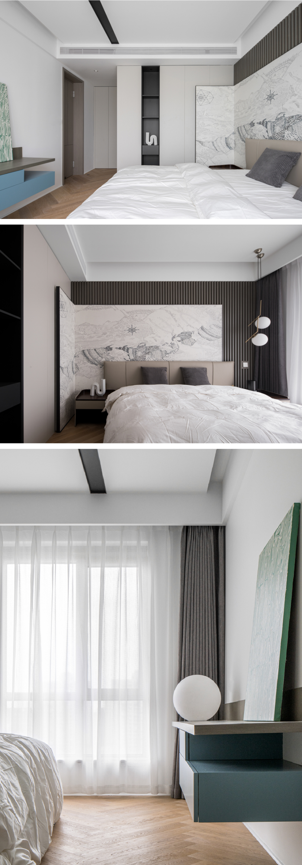 主卧背景墙以木格栅打底,叠加立体线条绘板,在留白中勾勒出丰富的层次与艺术气质。睡眠区与衣帽间以通顶衣柜自然区隔,在保障双方独立与收纳的同时,最大限度维持了空间通透。