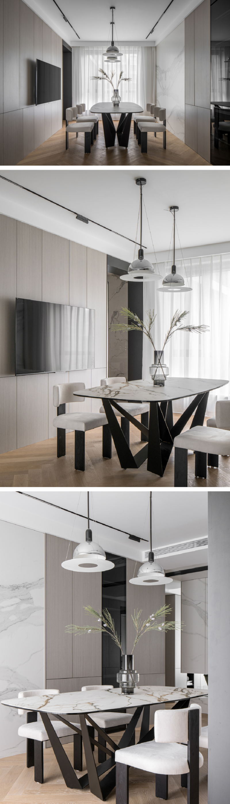 家的重心,随人而安。电视被温柔地请入餐区,让陪伴与烟火气共存。整面温润的木饰面从客厅延伸而来,悄然统一着空间的基调。而一侧冷冽雅致的大理石墙,则在光影下诉说着不同材质对话的故事,简约中蕴藏着无穷回味。