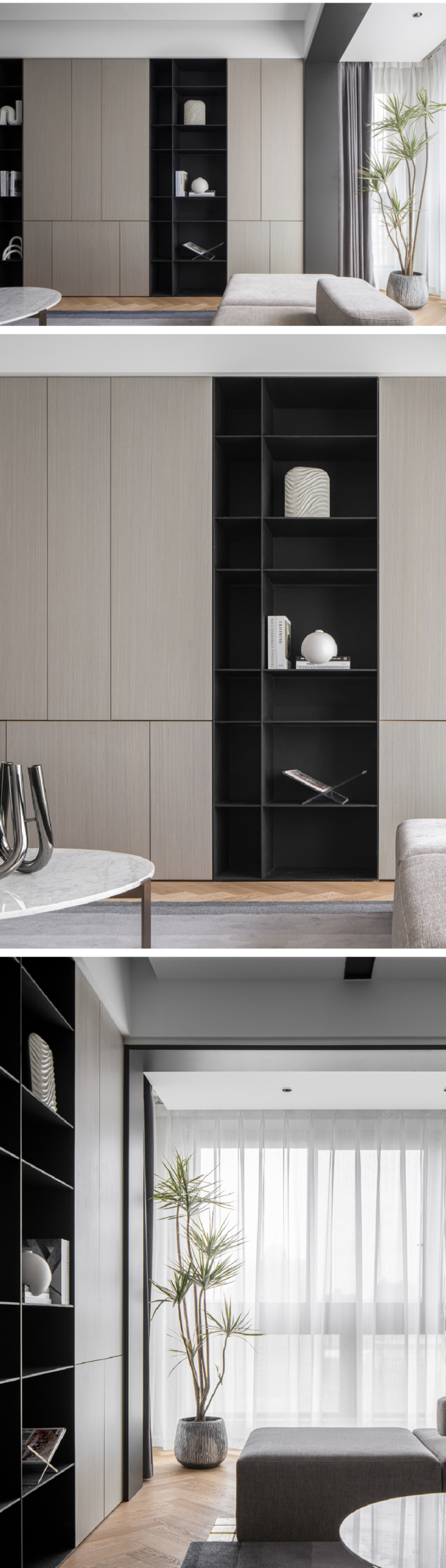 阳台被温柔地“请”进了客厅,阳光与视野再无阻隔。沿着墙体,一排顶天立地的组合柜自然生长而出:温润的原木柜门藏着生活琐碎,深邃的黑色开格陈列着心爱之物。这不仅是一面墙的收纳,更是家的一段生动表情。